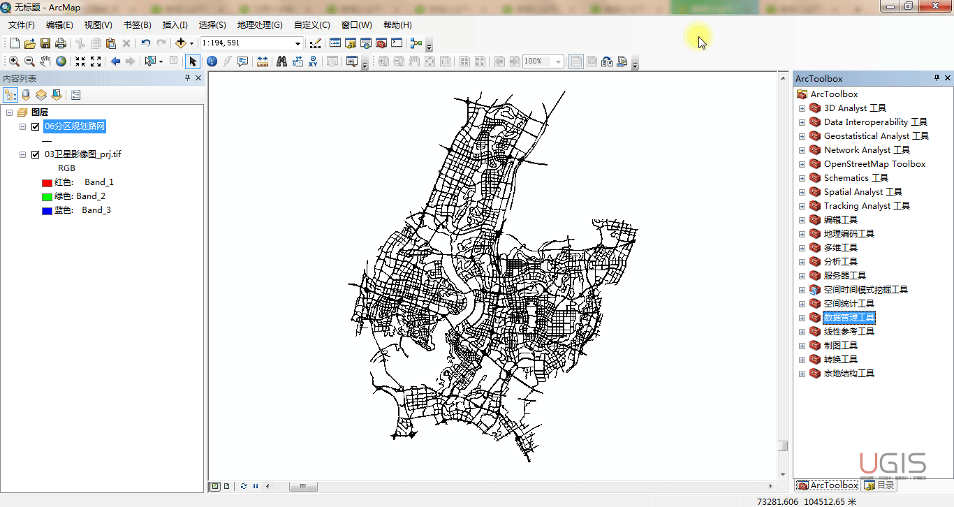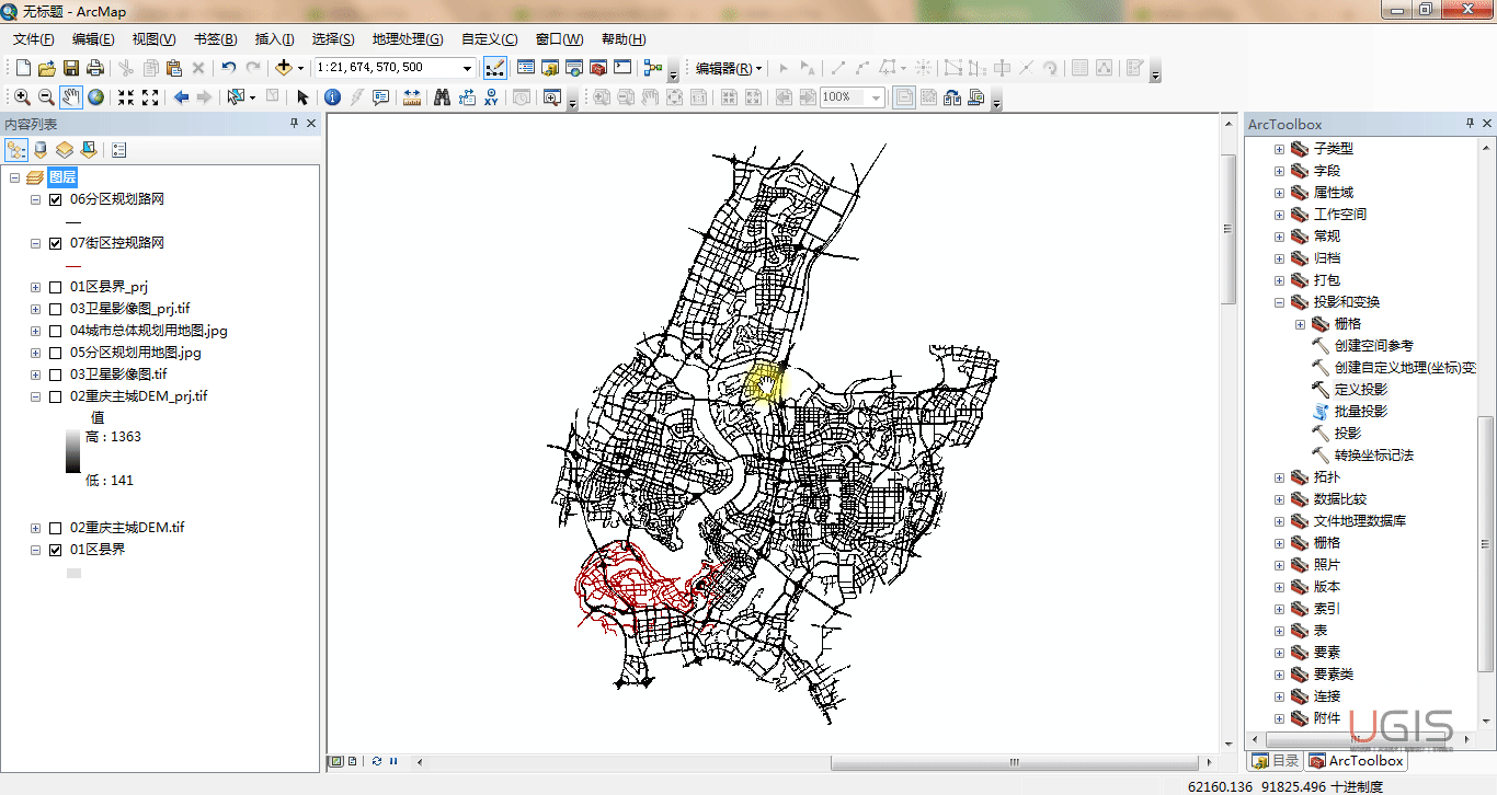 (1)如下图,是分区规划道路网和街区控规道路网,这两个图层均是通过规划CAD转换为SHP文件所得,从图上我们可以看到两个图层是可以叠合的,说明他们应该是用了同一个平面坐标系,然而他们又无法和我们已经投影了的数据直接对其,说明他们又不是UTM投影的WGS1984坐标系,再看右下角的坐标值为(55868.133,82387.492),很明显也不是我们国家常用的西安80或者北京54坐标系,那我们初步判断这两个数据均是采用的重庆独立坐标系(一般城市级别用地规划都会采用地方独立坐标系),而这个坐标系信息是保密的,我们无法获取,也就无法直接定义。