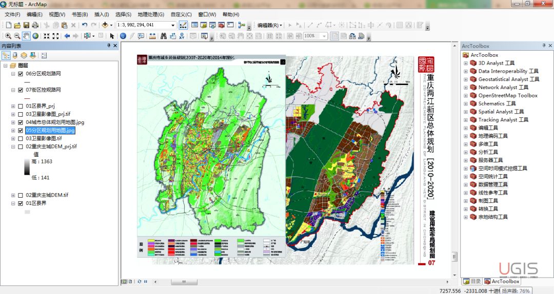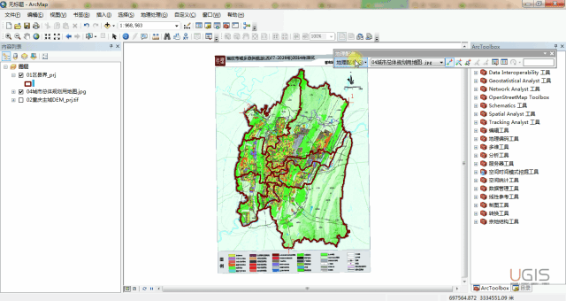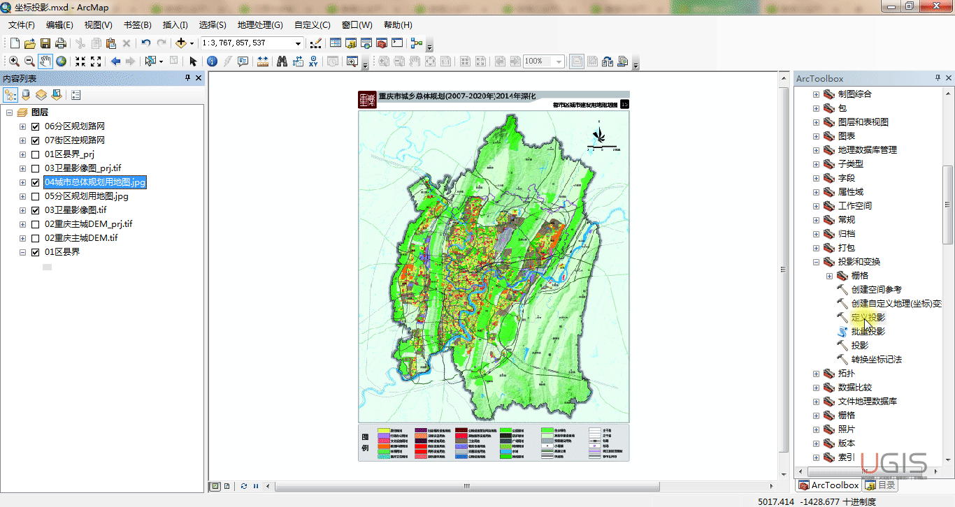 (2)按以上相同的操作方法,对城市总体规划和分区规划JPG格式文件进行坐标系定义。