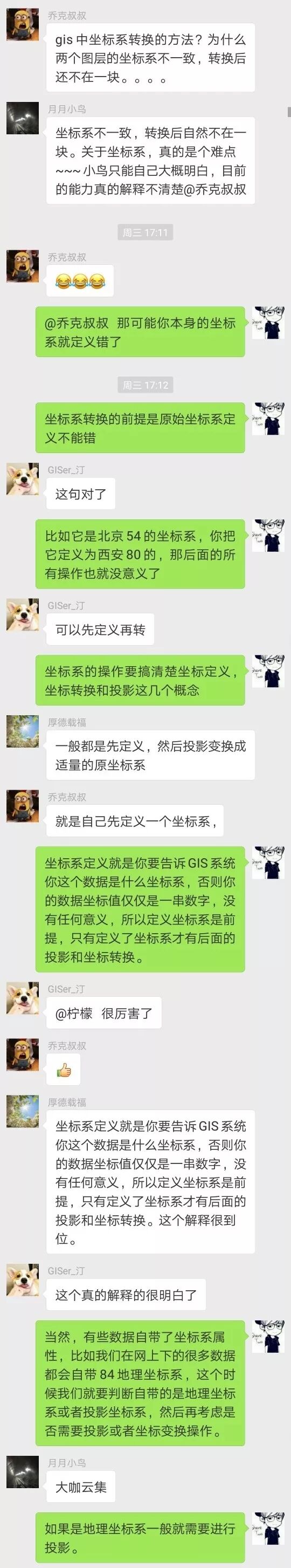 之前在某学习交流群跟几个群友交流讨论起坐标转换和投影的事儿,如果看了以下对话就明白了坐标系和投影的事儿了那就可以不看本文了,如果还是迷迷糊糊那么可以继续往下看,我相信通过本文的分解,应该能帮助很多GISer新手理解并掌握ArcGIS中坐标系和投影的常规操作了。