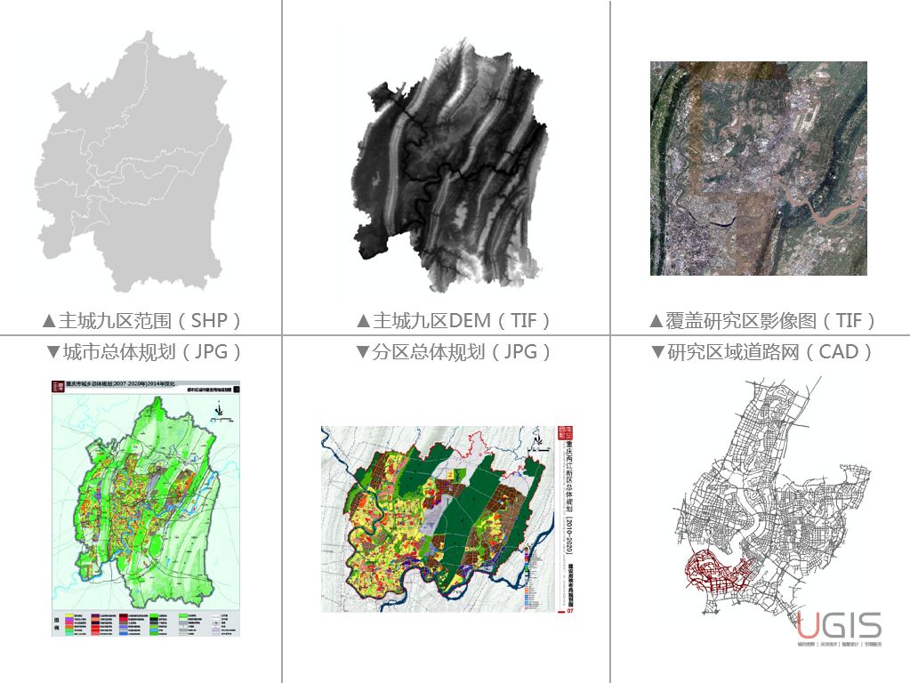 如下图所示,我们以重庆市两江新区某街区控规路网及分区道路规划为例,我们需要将DEM(TIF)、卫星影像(TIF)、城市总体规划(JPG)、分区规划(JPG)等进行叠加对比,以便查看现状建设及相关规划情况。