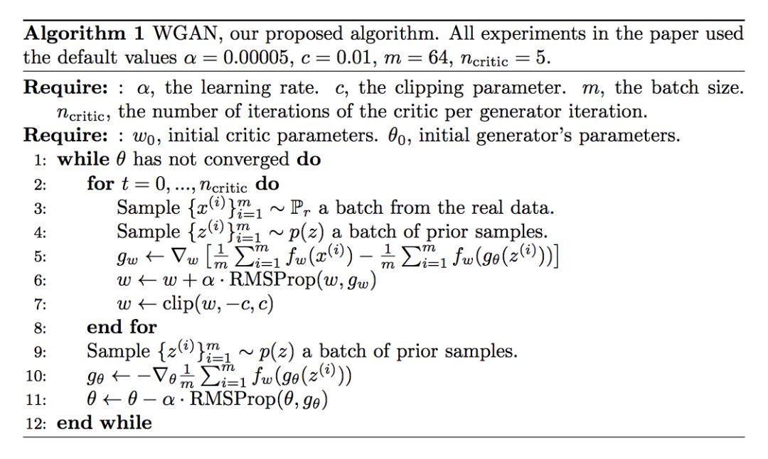 论文作者给出了如下的完整的 WGAN 算法流程,一方面优化含参数 ω 判别器