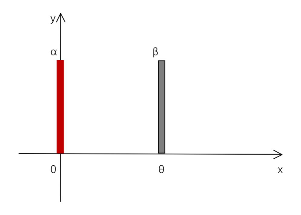 考虑如下二维空间中 ,令 Z~U[0,1] ,存在两个分布 P0 和 Pθ,在通过原点垂直于 x 轴的线段 α 上均匀分布即 (0,Z),令 Pθ 在线段 β 上均匀分布且垂直于 x 轴,即 (θ,Z),通过控制参数 θ 可以控制着两个分布的距离远近,但是两个分布没有重叠的部分。