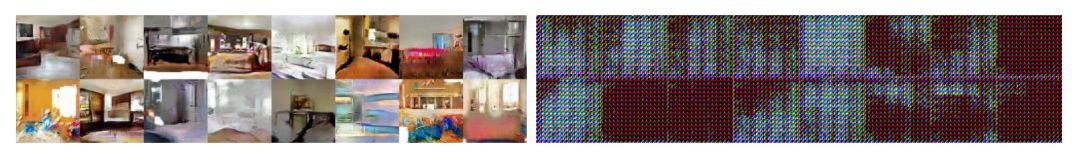 而如果都不使用批标准化,左图的 WGAN 生成质量很好,而右图的 DCGAN 生成的质量很差。