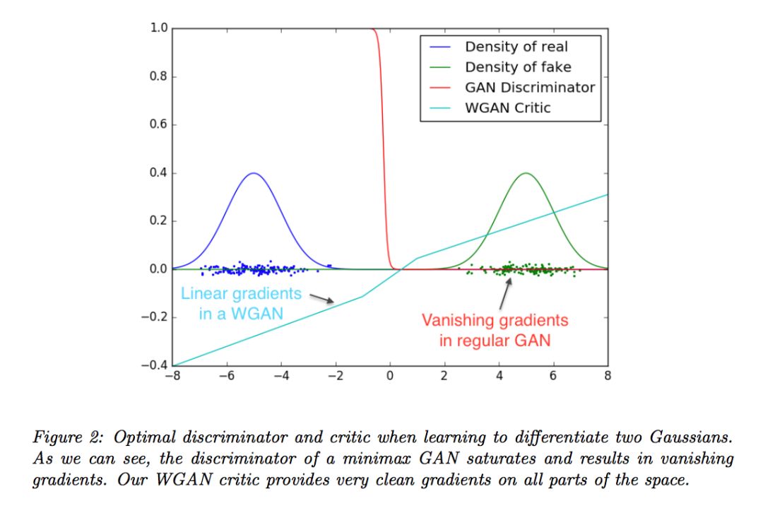 论文中提到加了限制的好处,原始的 GAN 是最终经过 sigmoid 输出的神经网络,在靠近真实分布的附近,函数变化平缓,存在梯度消失现象,而使用了限制的 WGAN 在训练过程可以无差别地提供有意义的梯度。