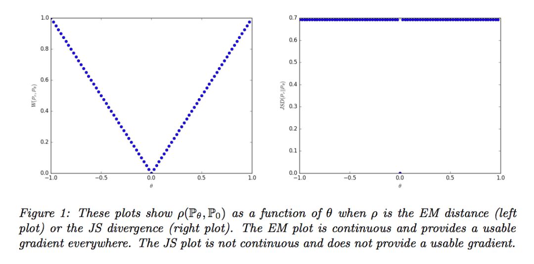论文作者提出一个简单直观的例子,在这种情况下使用 EM 距离可以收敛但是其他距离下无法收敛,体现出 Wasserstein 距离的优越性。