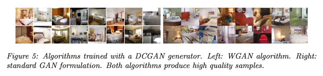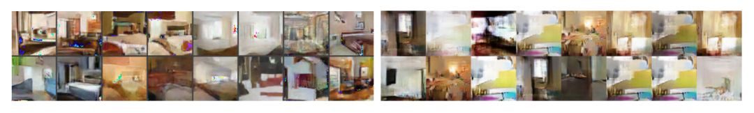 论文实验表明 WGAN 和 DCGAN 都能生成的高质量的样本,左图 WGAN,右图 DCGAN。
