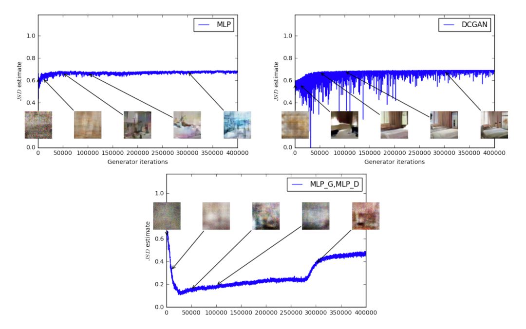 对比与 JS 散度,当模型训练得越好,JS 散度或高或低,与生成样本质量之间无关联,没有意义。