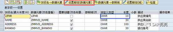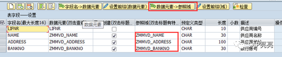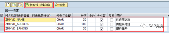 这时,我们分析哪些DTEL需要DOM。比如供应商名称、供应商地址,可能都是要允许大小写的,这种就需要创建DOM (用来设置允许大小写)。点“数据元素->参照域”,DTEL会自动复制到DOM中,结果如下:
