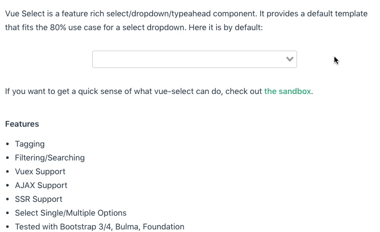 Vue Dropdowns是另外一个处理select标签的库。不仅可以创建流畅的输入,而且提供更好的方式去设置数据以及提供事件监听比如change和blur。