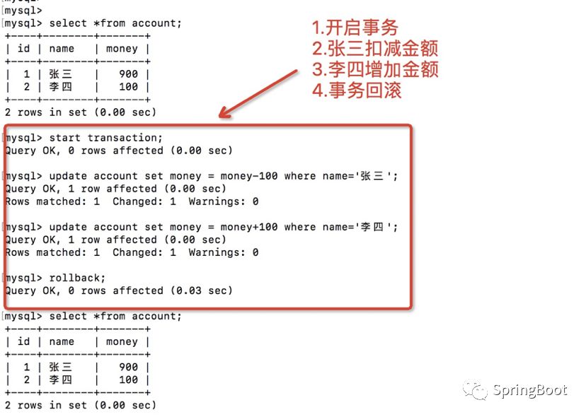 事务回滚之后,对于张三和李四的金额的操作都失败了,这就确保了事务的原子性。