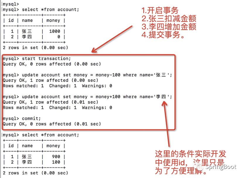我们先看下事务正常提交的情况,下面我们在数据库模拟张三给李四转账成功的场景: