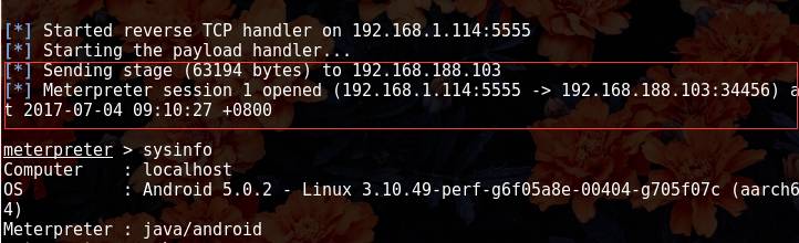 红色框出的地方就说明手机上线了 然后可以输入sysinfo 查看手机信息