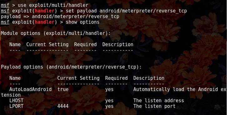 这个payload里边有两个参数要设置 LHOST和LPORT 表示地址和端口 默认的端口是4444 现在我们来更改设置