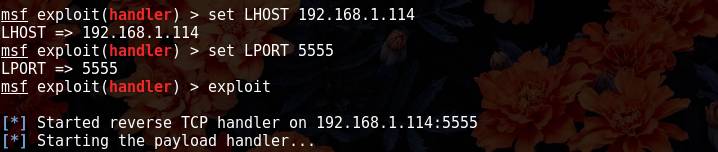 2.set LPORT 5555 //这里的端口设置成刚才我们生成木马所监听的端口