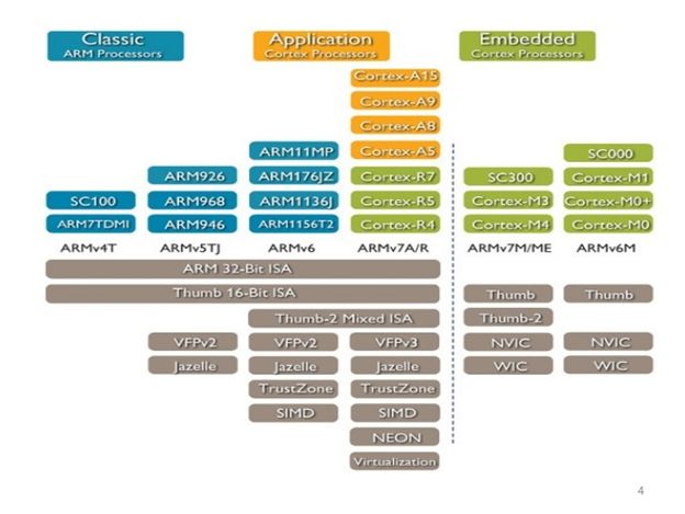 早期的处理器现在被称为经典处理器,例如曾经广泛使用的arm7/arm9/arm11处理器。现在主要的是Arm Cortex 系列,又分为3类: