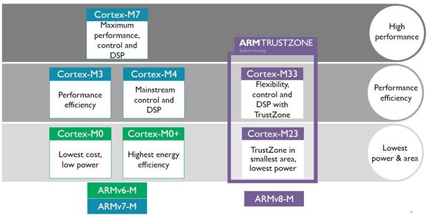 目前我们能买到的最新的是Cortex-M33,M23处理器,是基于V8M架构设计的,主要功能是在原来M7和M0+基础上增加了安全功能和浮点运算能力,例如支持Trust-zone。