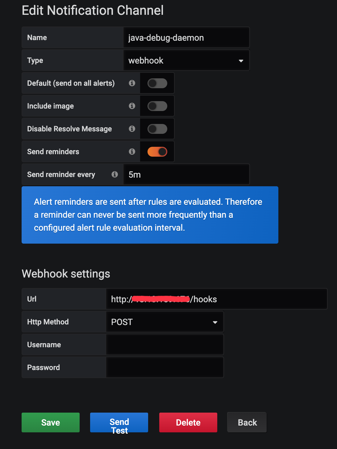 - 为 Grafana 添加 webhook 类型的告警通知渠道,地址为该程序的 url(默认的hooks路径为 /hooks)。