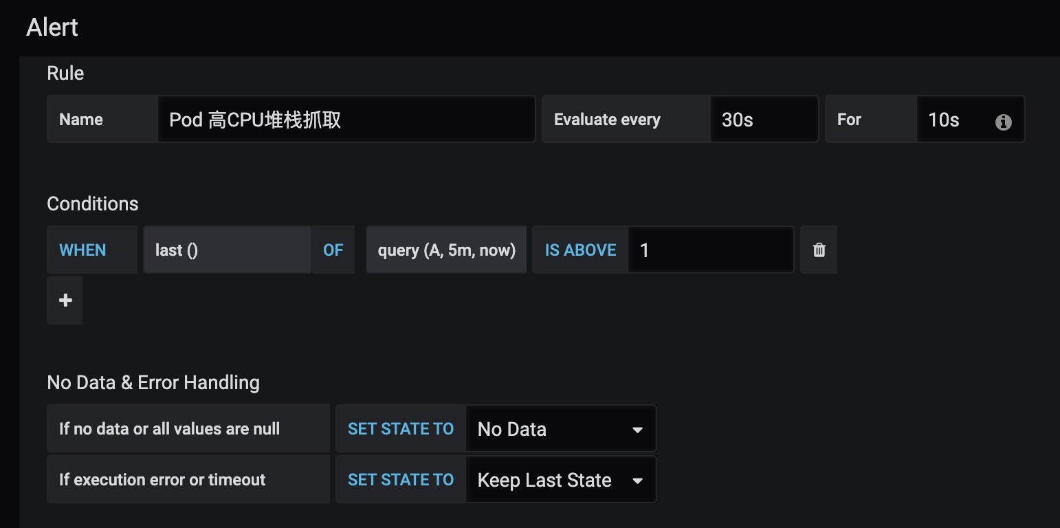 利用了 Grafana 的告警机制,配合阿里的 arthas,来完成高CPU使用率线程的堆栈抓取。