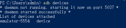 然后我们调用adb devices来获取当前的安卓设备,我这里是一个模拟器。