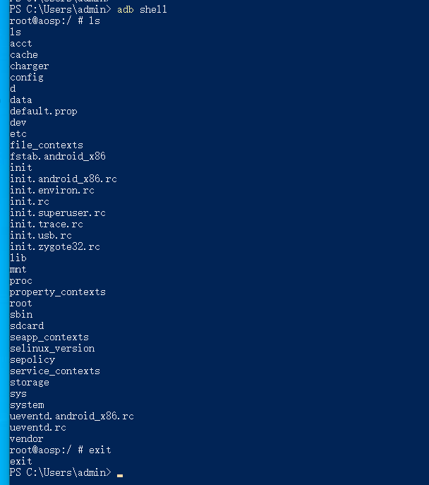 接下来可以调用adb shell测试一下是否能进入到安卓设备的shell环境下,确认可以输入exit退出即可。