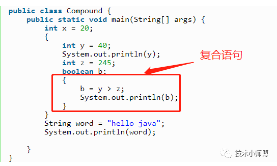 - 复合语句: 也成为块语句,这是为了更好的阅读性,多语句放到一起,并用{}做包含,看一下就是一个符合语句: