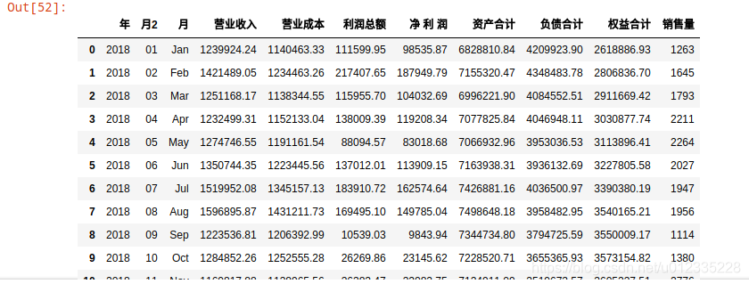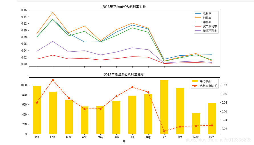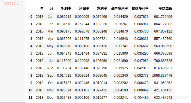 df7 = df6.loc[(df6['年']=='2018'),['年','月','毛利率','利润率','净利率','资产净利率','权益净利率','平均单价']]