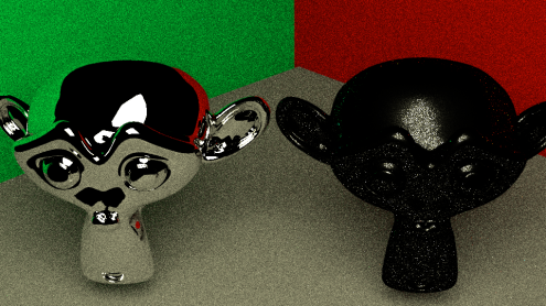 左边的猴子是纯反射brdf,这在我之前的博文中提到过,右边的猴子使用microfacet模型,粗糙度值为0(对于一个平滑的光面,光线大体上更趋向于向同一个方向反射,造成更小更锐利的反射)。我本来以为这两只猴子会有类似的结果,但事实证明这里是错误的,我们几乎看不到猴子的反射。其实没有什么问题,事实是,默认采样的粗糙度为0的microfacet
