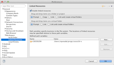 * Click **New** button to add a Path Variable `COCOS2DX` pointing to the root cocos2d-x directory.
