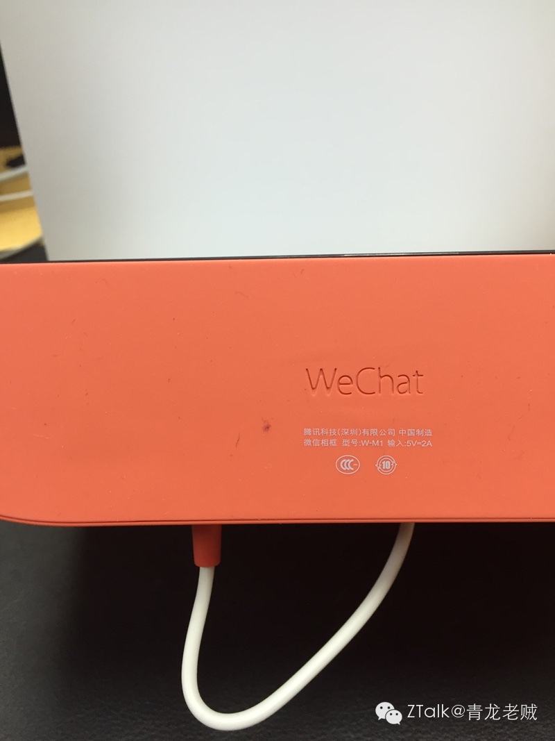 微信相框整個產品的外觀和配置都體現極簡主義,外殼是塑料的但手感不錯,唯一讓我納悶的是為什么這個相框用的是桔色……而不是微信的綠色!估計這個還是測試機,后續會有各種顏色供選擇。