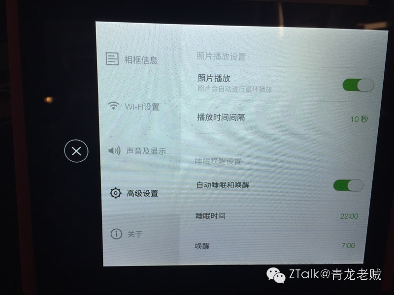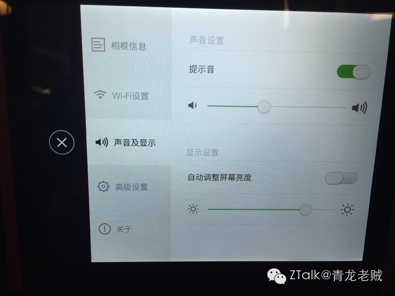相框的顯示界面很簡單,只有照片,發送者,描述,點贊和設置。功能設置如下,值得關注的是這個相框是帶聲音設置的,也就是說不光是可以顯示圖片,也可以播放語音。
