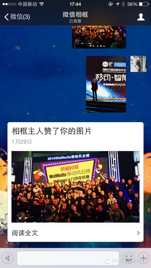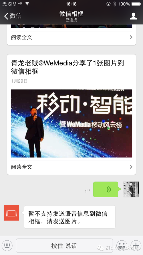 當相框上有人對照片進行點贊操作時,分享該照片的用戶會收到微信提示。
