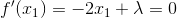 對上面三個公式求解,可以很容易得到(x1,x2) = (1/2,1/2)為極值點,並且λ = 1。