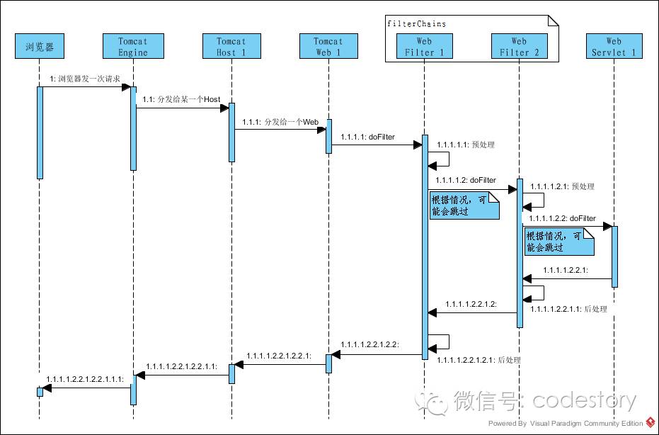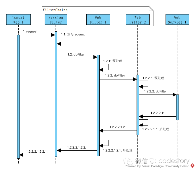 Filter的調用入口函數是doFilter,傳入的主要參數是request和response。在此之前,Tomcat已經創建好request。通常情況下,業務代碼不需要關心request和session等對象如何創建的問題,只需要使用即可。每個過濾器的實現,當需要繼續流程的時候,只需要將得到的request和response傳遞給下一個filter就行。