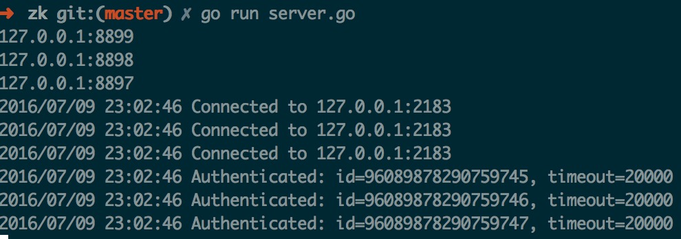 上邊的代碼里邊我們測試了golang對zk的連接、創建節點、或取節點操作,在下邊的分布式server中將用到這幾個操作。