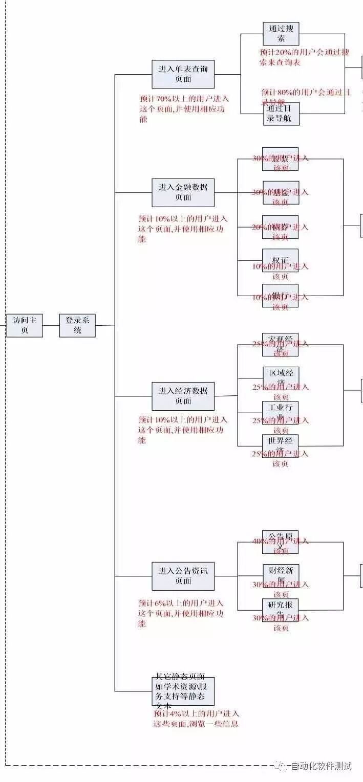 下圖展示了如何將整個系統,按照用戶操作業務的比例來構成一個整體的認識,通過功能的比例,我們很容易就可以得出其性能測試需求覆蓋哪些功能