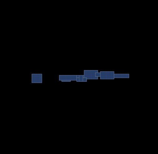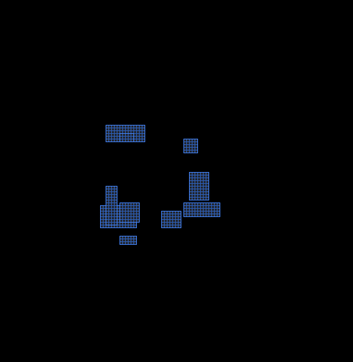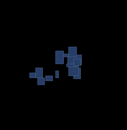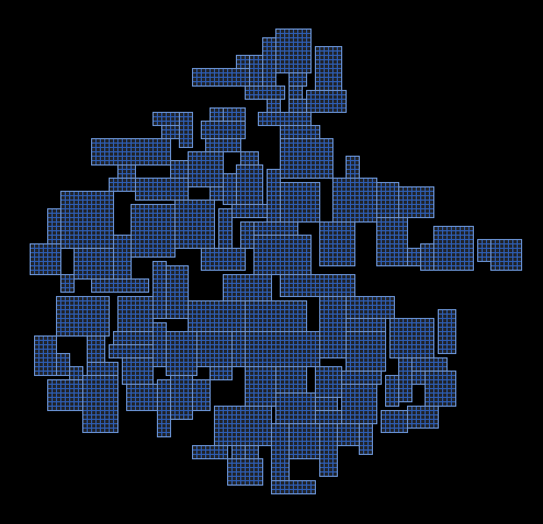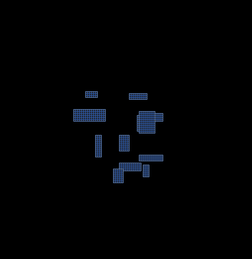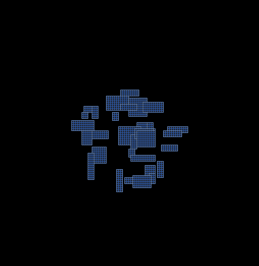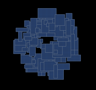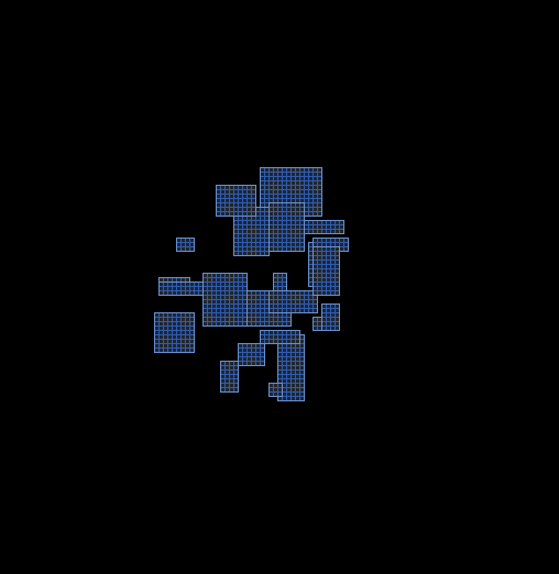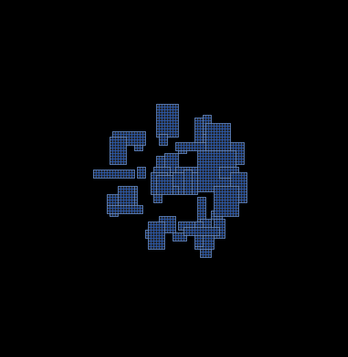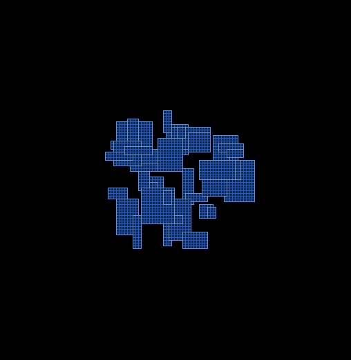 這些物理物體本身並沒有和tile網格相聯系,但當設定了房間位置並且和隨即指令放到一起的時候,你就會得到這些並不重疊的房間,而且這些房間與tile網格是匹配的,下面的gif對此進行了展示,藍色外形是物理物體,在它們和房間之間總有一些不匹配,因為他們的位置始終是分散的。