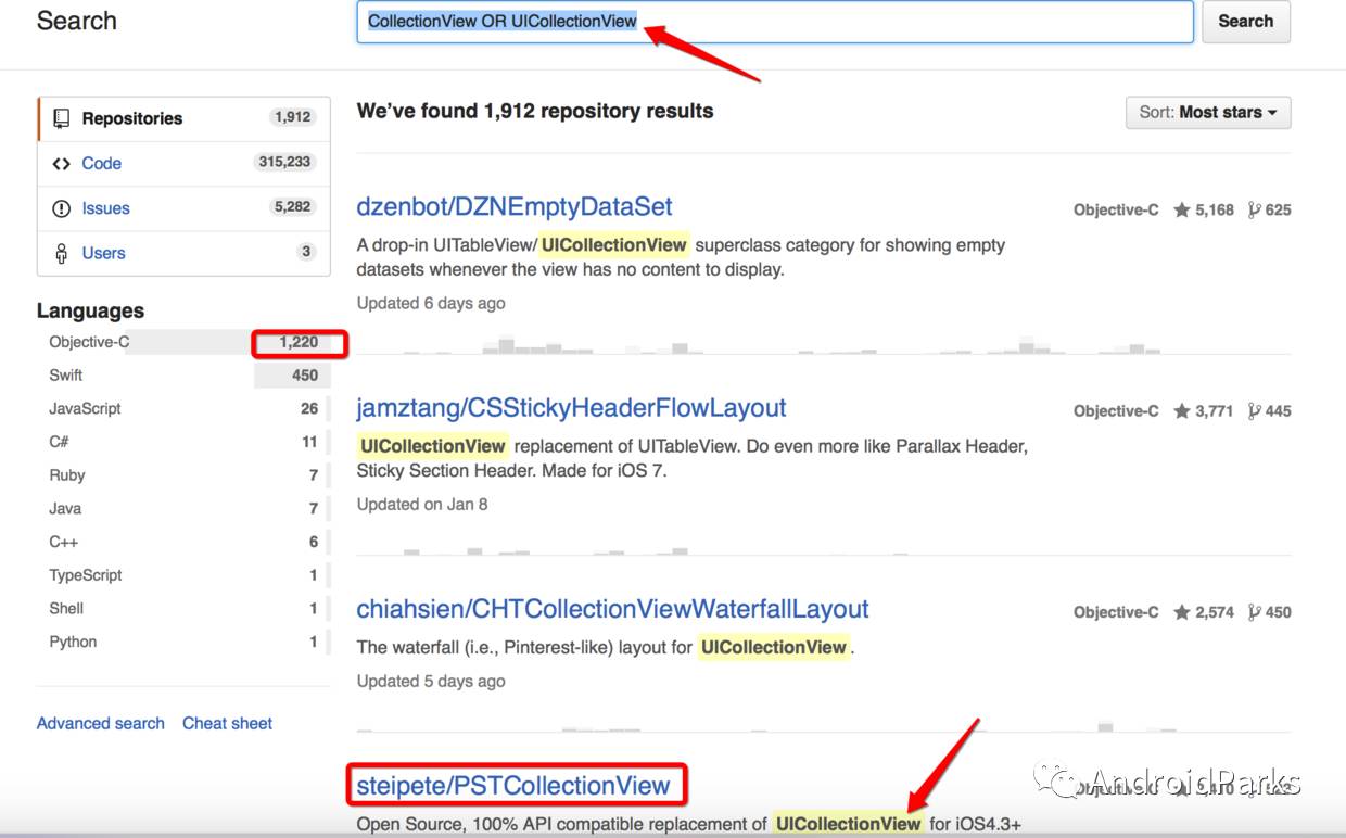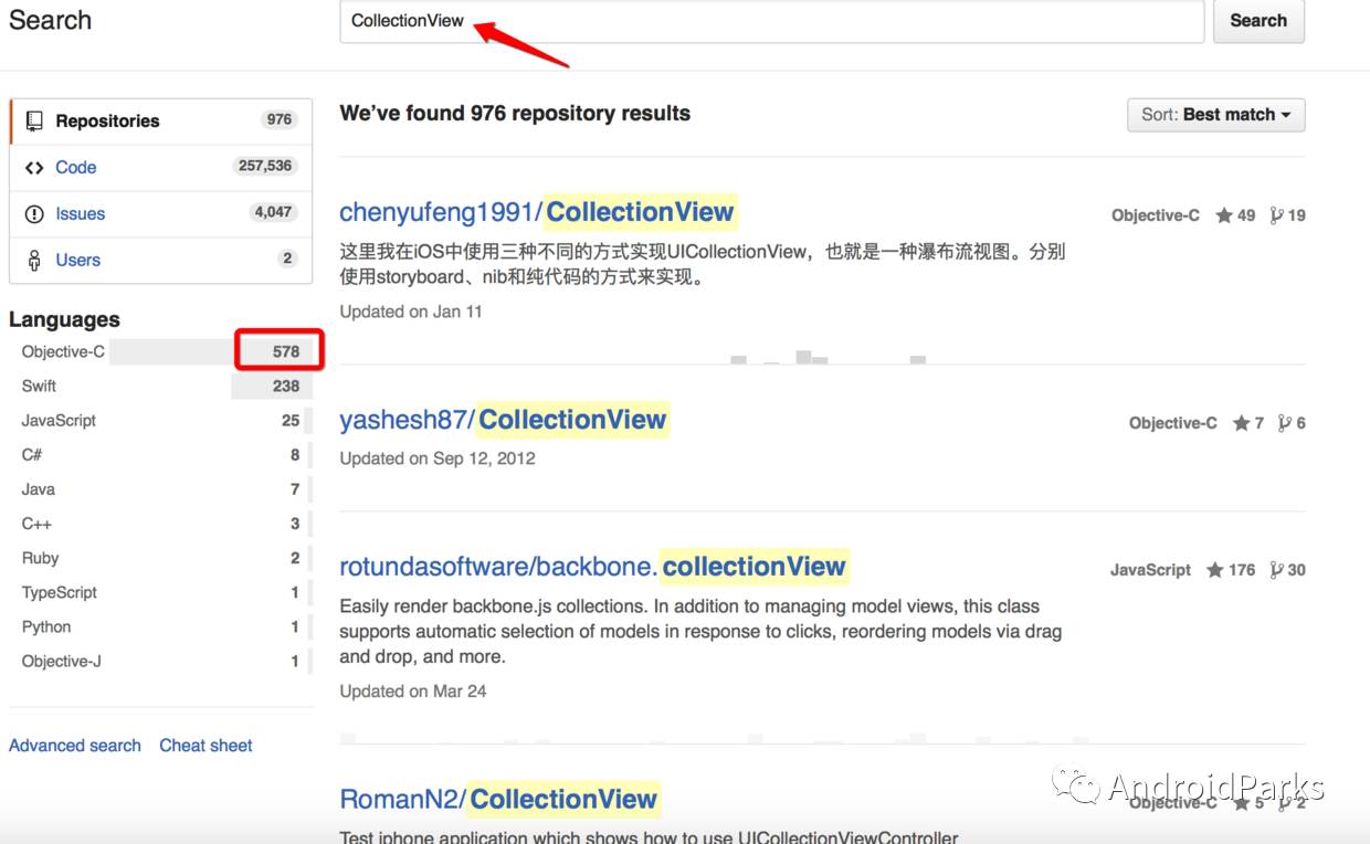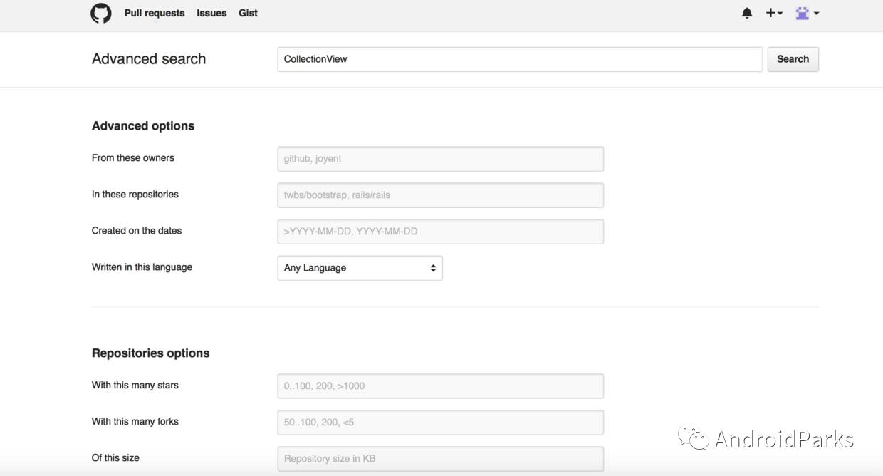 github搜索技巧,設定條件進行搜索:https://help.github.com/articles/searching-repositories/