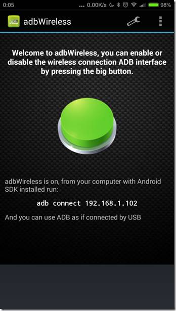手機、PC處於相同的網絡下,手機 root ,安裝應用 adbWireless ,啟動應用后點擊界面中間的按鈕: