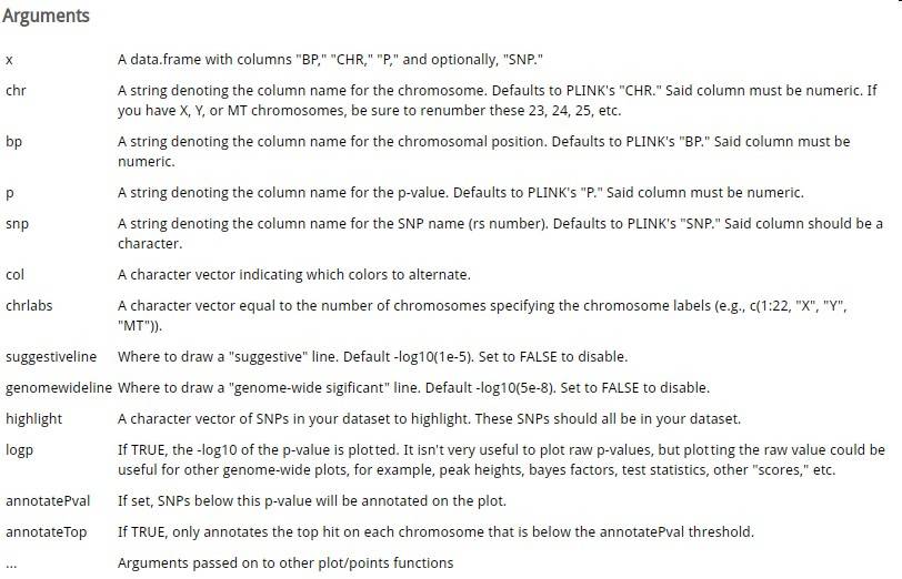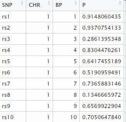 表頭依次是SNP(snp名稱,字符型,命名時以“rs”開頭),CHR(染色體編號,整型),BP(鹼基位置,整型),P(數值型)
