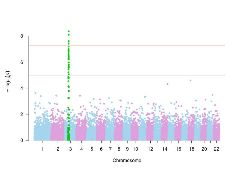 manhattan(gwasResults,highlight = snpsOfInterest,col=c("#A4D3EE","#DDA0DD"))