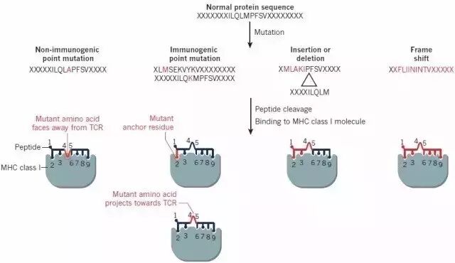 這種會引起T細胞活化的異常蛋白即我們所稱的“新抗原(neoantigen)”,能夠產生新抗原的突變即為具有免疫原性的突變(immunogenic mutation)。