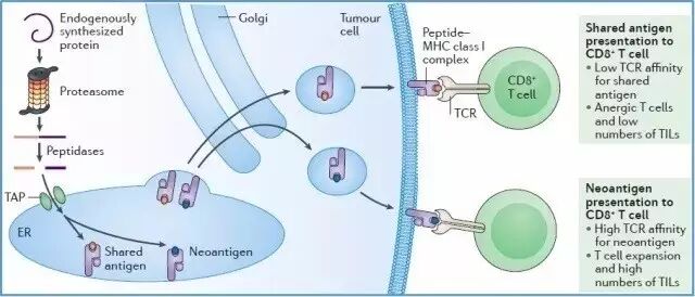 這些異常蛋白,如果在細胞內(腫瘤細胞或APCs)被降解成短肽段(抗原表位),與MHC-I類或MHC-II類分子高親和力結合,並以復合物形式呈遞到細胞表面,被T細胞識別為“非己(non-self)”,引起T細胞活化,進而腫瘤細胞被效應T細胞攻擊和清除(如圖1)[2]。