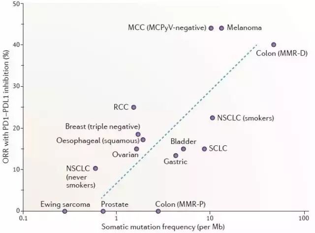 很大一部分腫瘤TMB> 1/1Mb,< 10/Mb,能夠產生新抗原(regularly),對PD-1/PD-L1抑制劑可能敏感,有些需要聯合治療來增加新抗原的產生。例如在臨床上,不經過篩選,確實也看到了NSCLC一部分患者對PD-1/PD-L1抑制劑有效;