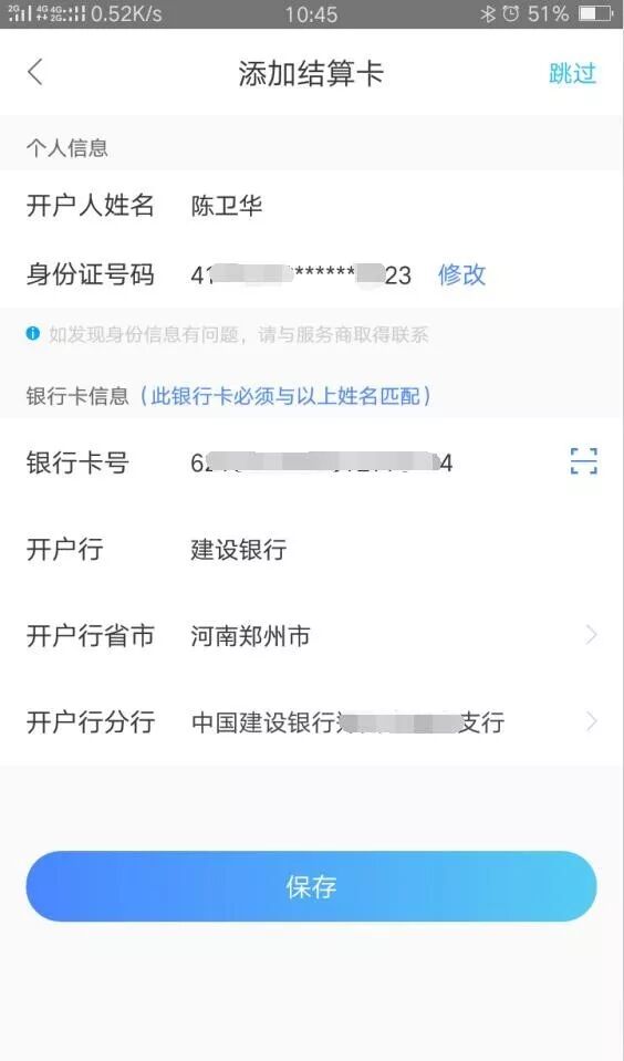 2. 注冊-身份證認證-結算卡綁定:用本人手機號注冊完成后,順着進行身份認證、以及儲蓄結算卡綁定。具體看下圖: