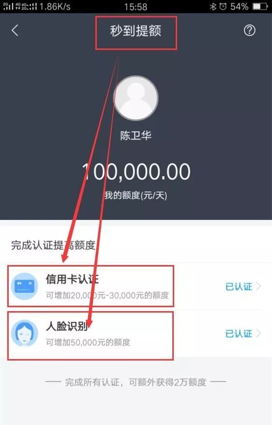 4. 提升額度:我的—秒到提額—人臉識別—信用卡認證,具體看下圖: