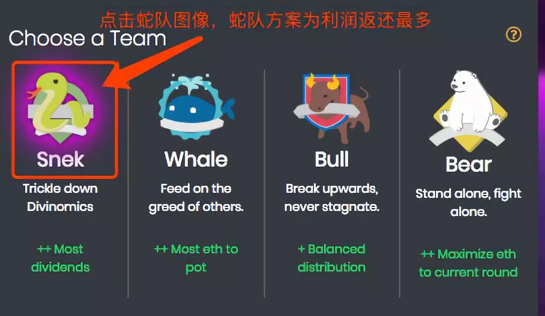 3.選擇隊伍,這個隊伍代表你 key 金額的分配方案,為了最大化收益請選蛇隊,可以幫你獲得更多的利潤返還。