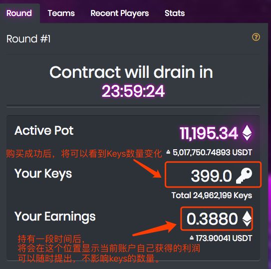 后邊參加進來的用戶的資金,將會持續不斷根據 key 的數量分配給持有者。直到 24 小時倒計時結束,再重新開啟新一輪的游戲。