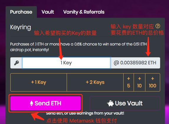 如果希望直接使用賬戶中得到的金額,再購買key,則可以點擊左側面板的「Use Vault」按鈕購買。