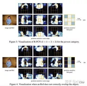 在訓練的過程中,當RoIs包涵物體屬於某類別時,損失函數即會使得該RoIs不同區域塊所對應的響應通道相應位置的特征響應盡可能的大,下圖展示了這一過程,可以明顯的看出不同位置的特征圖都只對目標相應位置的區域有明顯的響應,其特征提取能力是對位置敏感的。